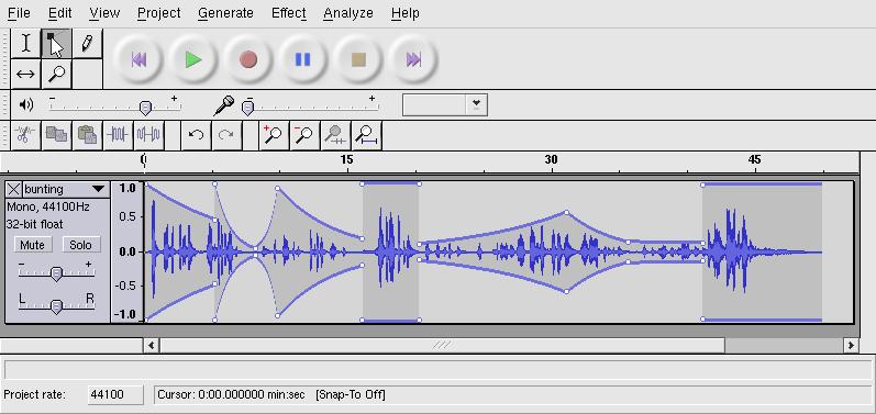 Audacity's graphic editing tools are a pleasure to use. Figure 6 shows off the envelope tool's effect on the amplitude contour of one of the soundfiles seen in Figure 5. At the individual sample level, Audacity's drawing tool makes it easy to remove or repair amplitude spikes and other discontinuities.