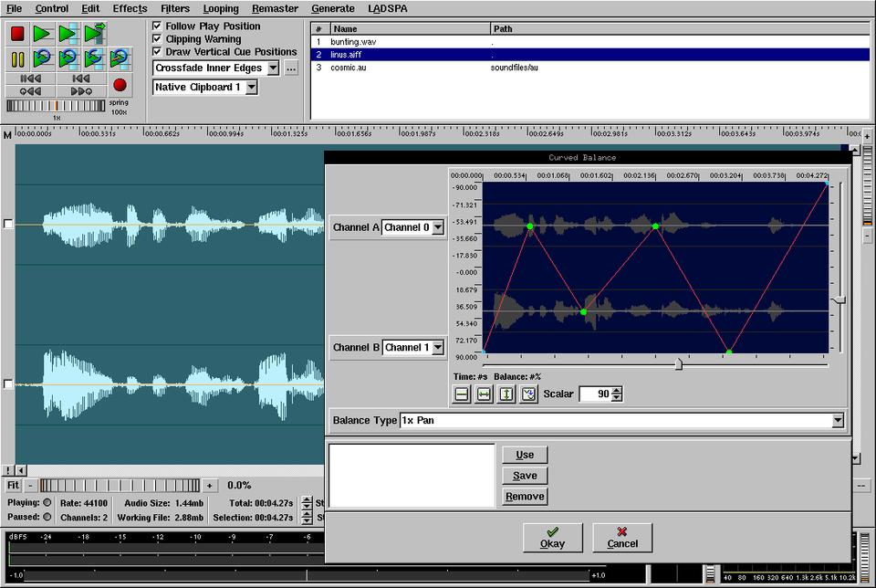 Figure 7 illustrates ReZound with three soundfiles loaded and the Curved Balance tool at work on the active file. Curved Balance is one of ReZound's remastering utilities; others include a noise gate, a dynamics compressor and gain and normalization controls. These tools, along with ReZound's other editing amenities, let you massage your sounds to perfection before burning them to CD. ReZound even provides a simple dialog for burning the CD (by way of the cdrdao program) directly from ReZound's File menu.