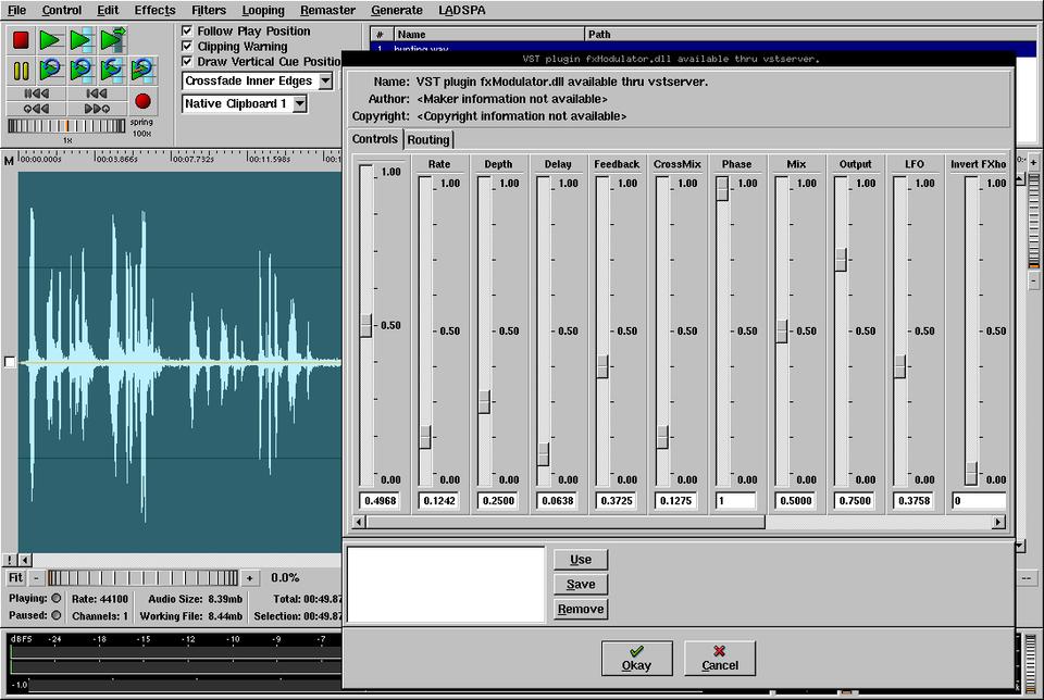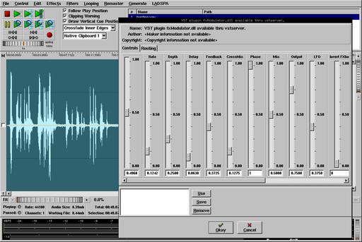 ReZound's LADSPA support extends to good basic support of the LADSPA VST host plugin (vst.so) from Kjetil Matheussen. This plugin to support plugins provides a usable interface based on WINE for running VST/VSTi plugins under Linux. The vst.so plugin currently is in its early stages, and its degree of harmony with the hosting application varies considerably. Figure 8 shows ReZound employing a VST plugin to apply an effect to the active soundfile.