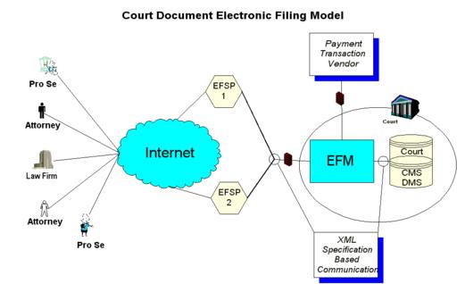 The current accepted model of how filings should be generated and passed to a court involves three major components. The first is an electronic filing service provider (EFSP), the organization responsible for constructing an electronic legal filing. There could be many of these organizations in any given legal jurisdiction, all competing for a per-filing fee paid by lawyers and pro se litigants (people who represent themselves in court) who use their service. The second component is an electronic filing manager (EFM). The EFM has a one-to-one relationship with a court. All EFSPs that offer the ability to file documents with a specific court need to communicate with that court's EFM. Court personnel use the EFM to review filed documents to ensure that any court-specific rules have been followed. The final component is an adapter that communicates between the EFM and the court's CMS and DMS systems. This adapter relays the documents and case information associated with the filing to the court's information systems. Figure 1 shows the organization of this model.