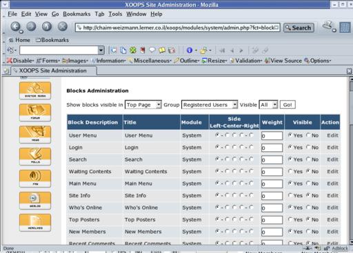 The default layout of a XOOPS site is rather empty. To include additional items on the home page, you must go to the Blocks administrative page, which lists the content features each module includes. The News module includes three blocks—bigstory, topics and top. The main Blocks Administration menu lets the site manager indicate which blocks are visible. But the real power happens in the Edit menu associated with each block, allowing you to indicate where on the screen the block should appear—on the side, in the center or somewhere else entirely.