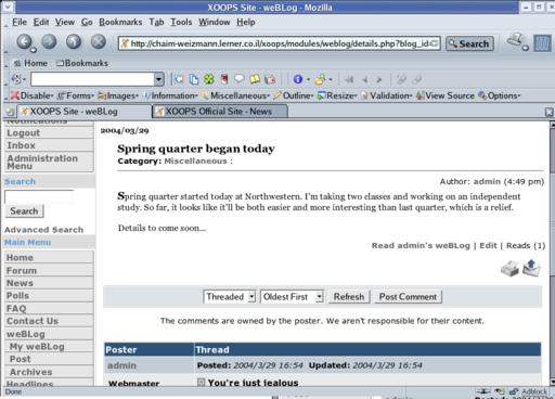 WeBLog provides a number of other useful features, ranging from RSS syndication to searchable and browseable archives, to the ability to comment on a posting. You also can ask to be notified when a new posting is added. Such notifications are placed in the XOOPS message system and are flagged on the main menu when you enter the site.