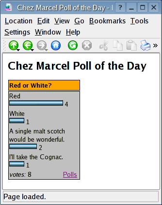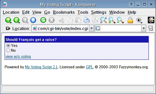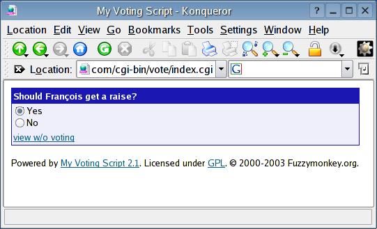 Ah, François, you have returned. Please, pour for our guests while I describe our first experiment in electronic democracy and a question that is near and dear to your heart. Democracy. Mes amis, you have seen Web sites with on-line polls of various sorts, asking questions ranging from serious to silly. With little effort, you can add a poll to your own Web site. The first item on the menu is Michael and Erin Spiceland's My Voting Script (see the on-line Resources section). To use this one, simply extract the tarball to your cgi-bin directory. On my system, it's /usr/local/apache/cgi-bin: