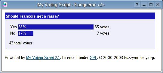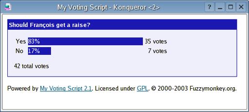 To register a vote, simply click on one of the answers, in this case, Yes or No. When the votes are entered, a pop-up window appears with instant results. A percentage of votes is tabulated along with a colorful bar offering a graphical representation of the results. As you can see in Figure 2, my faithful waiter has managed to garner amazing support for his raise.