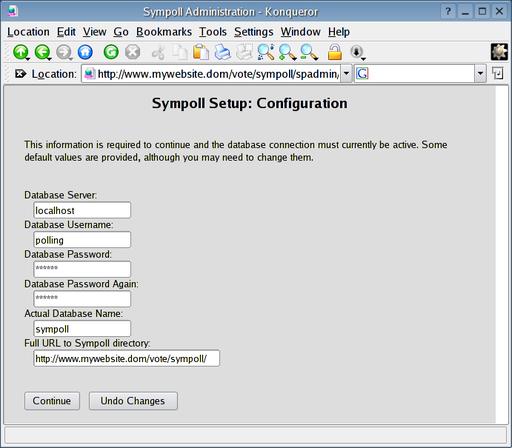 Extract the Sympoll source (see Resources) to an appropriate directory in your Web server's document hierarchy. For example, my document root is at /usr/local/apache/htdocs, so I extracted the source distribution in that location with tar -xzvf sympoll-1.5.tar.gz. Once the directory is in place, make sure that the config.php is writable by your Apache server, chmod 660 config.php. Before you head to your browser, I should tell you that the author recommends changing the name of the admin directory to something other than admin to make it a little harder to locate.
