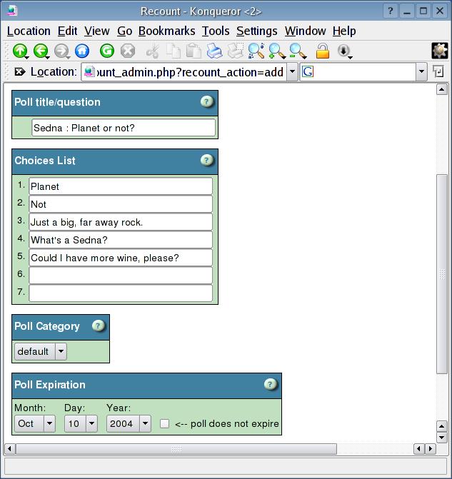 The final item on tonight's menu comes from Benjamin D. Jones, and it certainly sounds political. It's called Recount. It was inspired, apparently, by the 2000 United States presidential election. Recount is a PHP application that allows you to create extremely flexible polls, both in terms of how they are presented and how the results are generated. It uses either MySQL or PostgreSQL as its database.