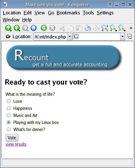 The package includes a ready-to-use page to test your new polls, called recount_testing.php. If you point your browser there, you can specify any poll ID. Both the poll and the results can be shown on the page. Creating a voting page for yourself specific to a given poll is easy. Have a look at this simple HTML/PHP page: