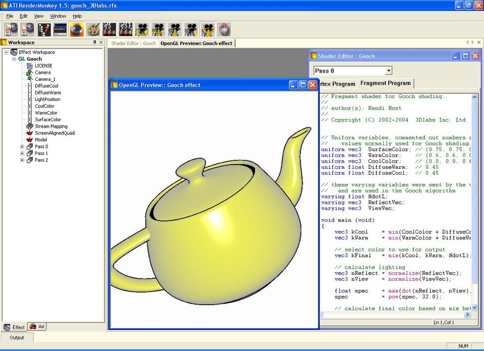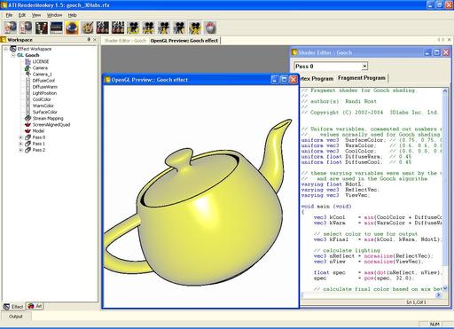 RenderMonkey 1.5 is an integrated, real-time OpenGL Shading Language development environment with a graphical user interface used to write and adjust shader attributes, such as the definition of color, textures, graphics states, scalars, vectors and matrices. It eliminates the need for handwritten OpenGL Shading Language programs for many visual effects. The shader development tool supports a plugin architecture that enables developers to create new, customized components as needed. RenderMonkey works with a number of shading languages, including OpenGL's, HLSL and assembly-level languages. Shaders and their attributes are stored in XML files for interchange with other applications.