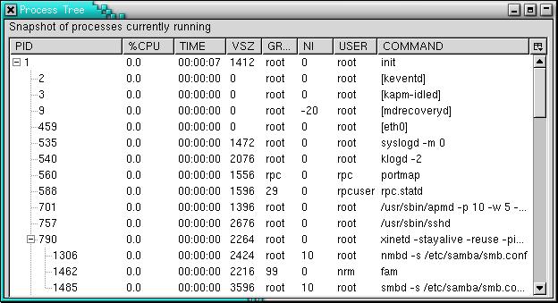 A tree is a good way to display a hierarchical list of processes, and a <template> is a good way to drive the appearance of a tree direct from data. No RDF document is available to work with, though; instead, we have a JavaScript array of records. The solution is to put a <tree> and a <template> tag together and set the RDF file to rdf:null = no file. A script is used to create the RDF content directly from JavaScript data. Because of RDF's peculiar design, the content can be dumped into the template in a careless manner and everything simply works. That's a far cleaner but admittedly a more subtle solution than hand-building an XUL tree from JavaScript. Another clean aspect of RDF and templates is the tree can be updated anytime in a simple manner. This means the window can display ps(1) data dynamically, as though a GUI version of watch ps H were run. That dynamic step is beyond this article's scope, however.