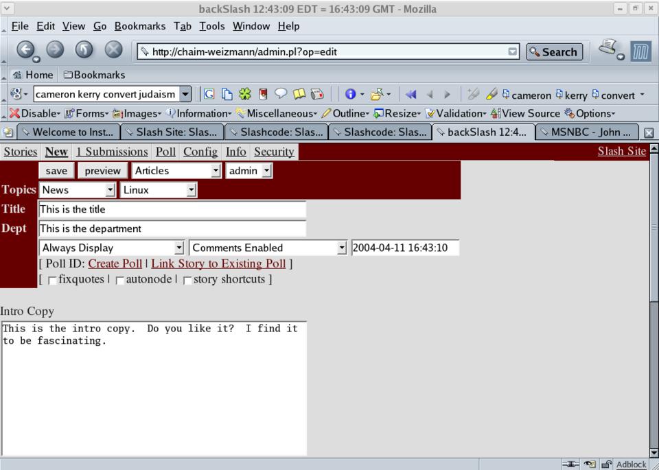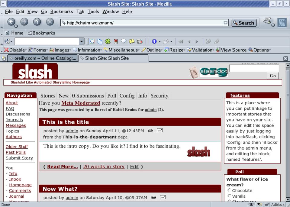 But, if you are at all familiar with the original Slashdot site, you should be able to start posting stories and soliciting comments right away. While logged in as the site administrator, click on the New link at the top of the home page. Enter a topic, title, department, intro copy (displayed on the home page) and extended copy (displayed on the individual story page). You even can set up a poll or link a story to an existing poll. Once the story is approved, it is visible to the entire world. Visitors to the site optionally can be allowed to comment and even can act as moderators. Indeed, the community moderation and meta-moderation of Slash stories is one of the most intriguing ideas that Slash has brought to the table.