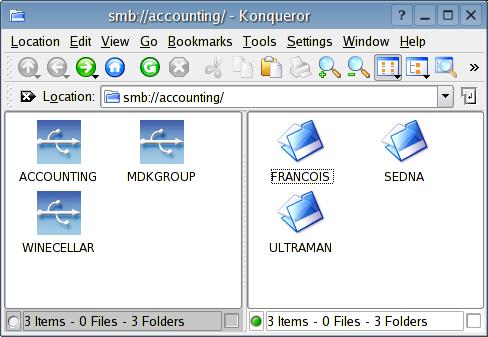 Samba servers or Windows machines advertising network shares first appear in the browser window under their workgroup name (for example, ACCOUNTING, SALESGRP). Figure 1 shows a Konqueror session with a two-panel view; click Window on the menubar and select Split View, Left/Right. In the left panel, we have the basic network browser view with three active workgroups. In the right-hand panel, I've clicked on the ACCOUNTING workgroup to show the computers belonging to that group.