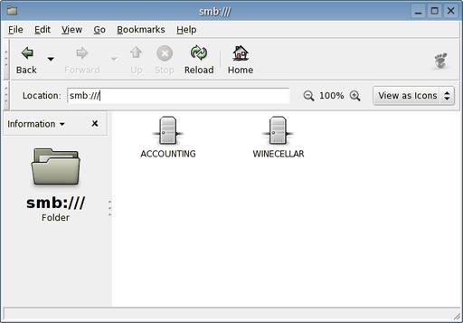 Over on the GNOME side of things, we have Nautilus. You should find the process similar to what we went through with Konqueror. Start Nautilus and type smb:/// in the Location bar. Nautilus then displays the active workgroups on the network (Figure 3).