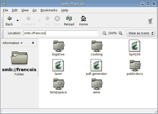 As with the Konqueror example before this, you can save yourself a little time by bookmarking the folder of your choice. The problem with both of the suggestions I've made is that neither of them lets you permanently mount network drives. Accessing a particular folder requires that you do a little command-line work, an easy enough process but not quite the point-and-click ease that Windows users on your network want to see. Let's have François refill our glasses while we take a look at a way to solve this dilemma.