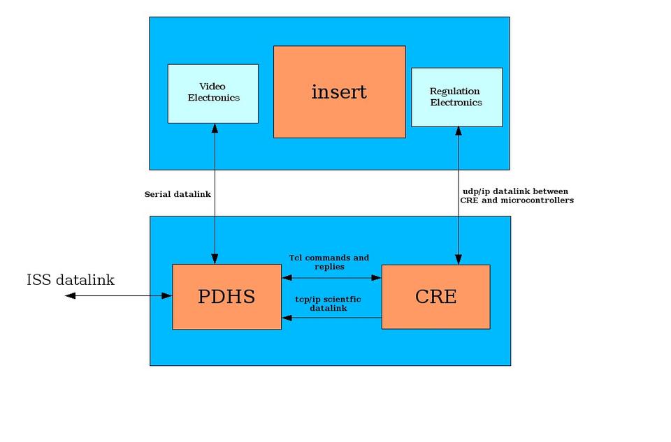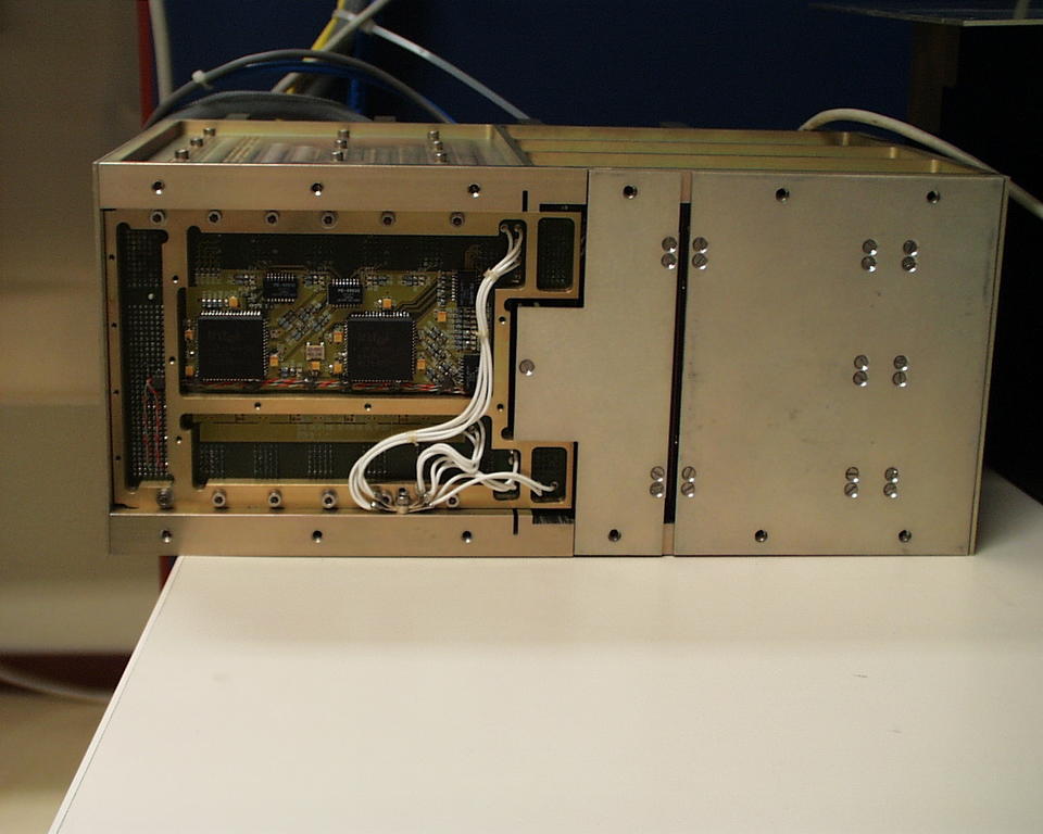 The second box (see also Figures 8 and 9) contains the electronics for data handling and temperature control. The electronics and software situated in this box is what I describe in this article. Two important subsystems are located in this second box, the power and data handling system (PDHS) and the central regulation electronics (CRE). The PDHS consists of a CompactPCI industrial Pentium PC running Linux, some microcontrollers and commercial PCI cards. It collects data coming from video cameras and the CRE, stores it on hard disk and interfaces with the ISS computers. Although a real-time link to ground exists, most of the data needs to be stored on hard disk. A removable hard disk will travel by space shuttle to give the scientists their valuable measurement data.