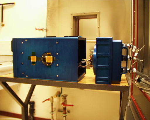 Figure 2. The sample cell unit of the ALI insert at the University of Amsterdam. The sample cell contains the liquid to be studied at a critical temperature. The blue box behind the SCU is the insert box.