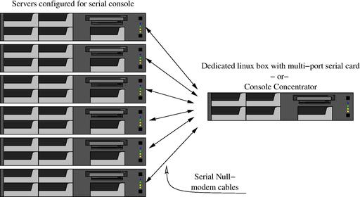 For remote access to a server's console, you can set up a console concentrator, which is a lot like a terminal server. It can be a homegrown Linux box with multiport serial cards, giving you as many ports as you have servers. With this kind of setup, you can access all your servers' consoles by logging in to a single dedicated Linux box.