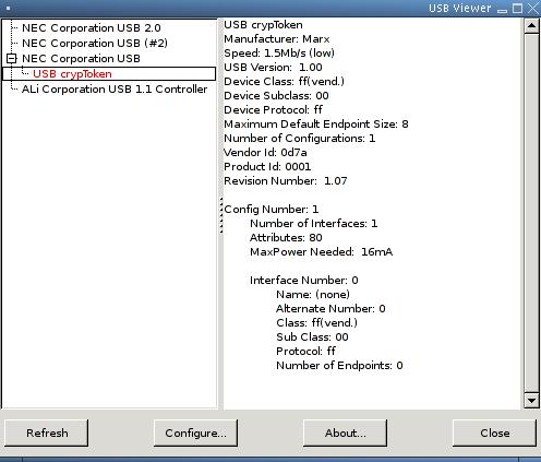 I plug the device in to my laptop and run a small program called usbview to learn what the Linux kernel thinks this device is (Figure 2). This device must be calling itself a USB CrypToken, as that is the string contained in the device. Unfortunately, the device name is in red, which means no kernel driver is bound to the device. I either have to write one or find a way to use libusb to talk to the device from user space (see my article “Writing a Real Driver—in User Space”, LJ, June 2004, for more information about libusb).
