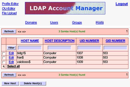 As with the edit screen for user accounts, group accounts can be dealt with rapidly. Host accounts are managed automatically using the smbldap-tools scripts. This means the Hosts edit screen (Figure 3) is not used in most cases.