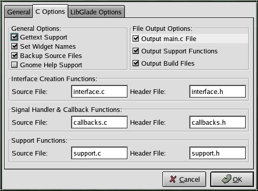 Figure 2. The Options dialog for Glade allows you to generate code, specify filenames and choose support for internationalized text.