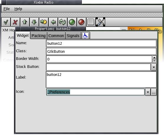 Ximba Radio required two primary windows, the Main Window and the Preferences Dialog, and a number of secondary pop-up windows. The Main Window's button bar was created with Glade's toolbar widget, and the buttons were added to that manually. GTK+ buttons can have text or images. Glade allows a choice of application images, stock buttons or stock icons. Stock buttons use the same icons as stock icons except that tooltips are not available. Because of this, I suggest using stock icons and leaving the stock button field blank.