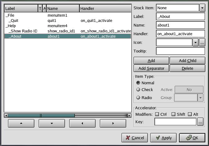 The Favorites buttons are plus signs. Glade and GTK+ call these Add icons. These buttons have a single callback attached to their click signal. The callback adds the current artist or channel to the appropriate list of favorites. The menu bar at the top of the main window was created using Glade's built-in Menu Editor. The editor has many options, but for this project I used only the Label, Name and Handler options, the latter to define the function to be called when the menu item was selected.
