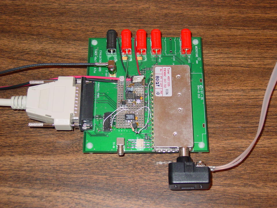 Our setup consists of a conventional FM dipole antenna, a cable modem tuner module mounted on an evaluation board and a 20M sample/second PCI analog-to-digital converter (ADC) card. The antenna plugs in to the input of the tuner module. The tuner module IF output is connected with a piece of coaxial cable to the ADC input on the back of the computer. The tuner module eval board is connected to the PC's parallel port so that we have a way of controlling the module.