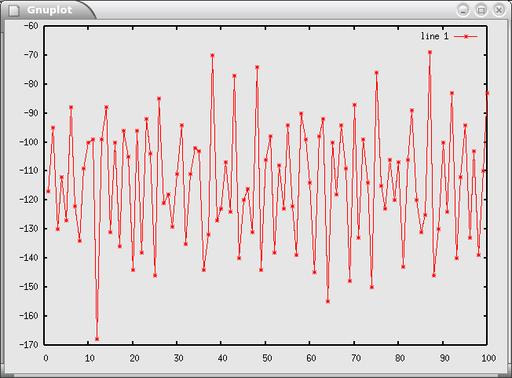 First off, let's take a look at what happens when we tune our front end to the middle of the FM band, say 100.1MHz. Figure 2 shows the received samples vs. time. This view, the time domain, is what you'd see on an oscilloscope. It's not particularly enlightening, but it does show that our samples are in the range of –170 to –70, which is fine. In an ideal world, they would be symmetric about zero. For our purposes, the offset won't matter.