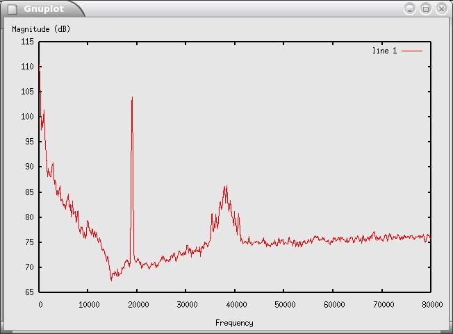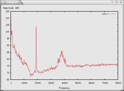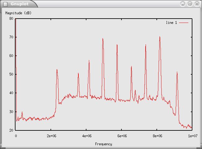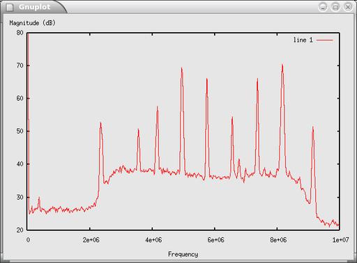 The frequency domain provides additional information. In this case, we grab 1,024 samples at a time and compute the discrete Fourier transform using the fast Fourier transform (FFT) algorithm. This gives us a representation of the frequencies that are contained in the input signal. Figure 3 shows the resulting spectrum. The x-axis is frequency, and the y-axis is power in decibels (10 * log10 power). The low end is at zero Hz, and the top end is at 10MHz, half our sampling rate.