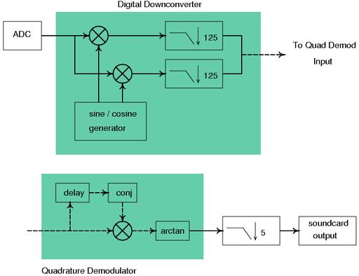 The code is split into three functions. main handles the argument parsing, manages the RF front end and controls the main signal processing loop. If we're receiving a single station, we tell the RF front end to put the station right at the center of the tuner's output frequency, the IF. If we're receiving two stations, we ensure that they're within 5.5MHz of each other. This restriction is due to the SAW filter built in to the cable modem tuner. It's a bandpass filter centered at 5.75MHz that's about 6MHz wide, the width of a North American TV channel. In this case, we split the difference and tune the front end exactly halfway between the two stations. build_graph instantiates the common signal processing blocks and connects them together. In both the single and dual-station modes, we use a single high-speed analog-to-digital converter for input and a single sound card for output. For each station that we want to receive concurrently, we instantiate a digital downconverter, quadrature demodulator and low-pass filter.