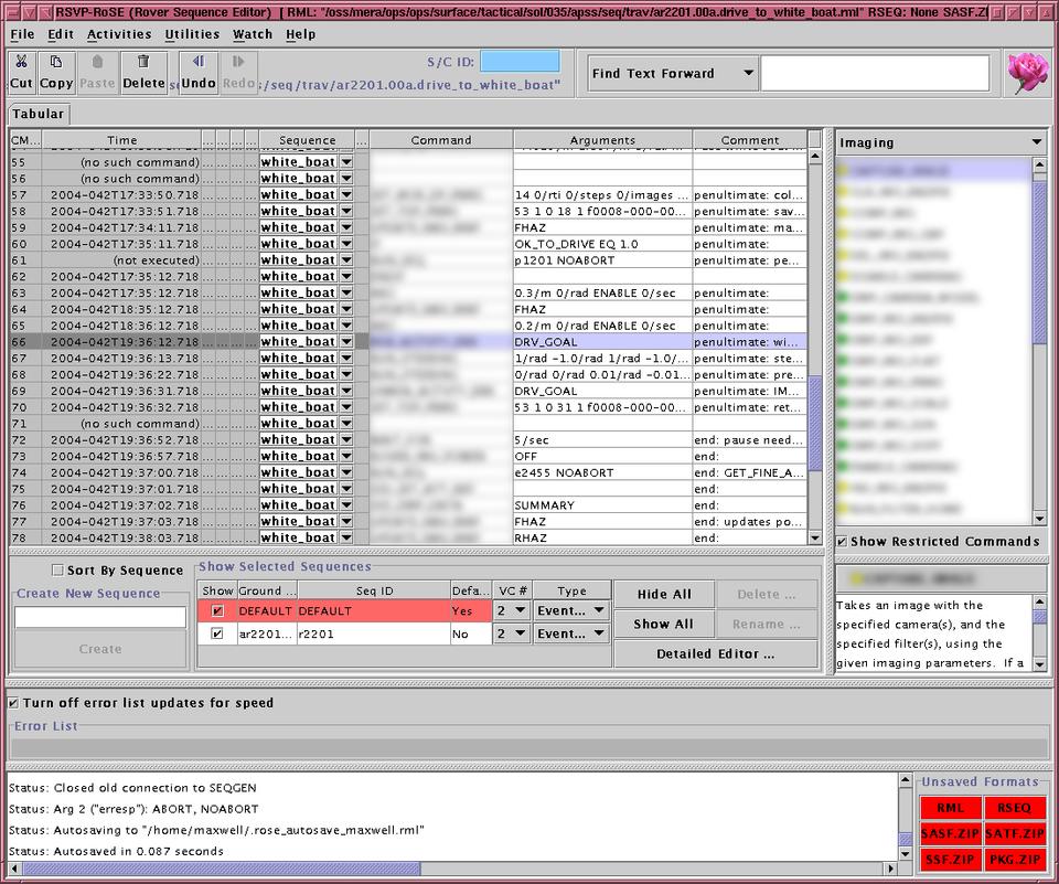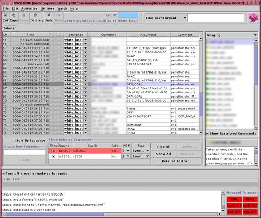 RoSE is aggressively data-driven, learning everything it knows about the rover from XML configuration files read at startup time. The IDE used for developing RoSE is good old tried-and-true GNU Emacs. Much of RoSE's GUI is built with hand-crafted Java code using Java's standard GUI toolkit, Swing. As nice as Swing is, hand-crafting GUI code sometimes is tedious; if a Java-supporting version of Glade had been available at the time, we likely would have used it. Still, important parts of the user interface are built dynamically. One of the XML configuration files RoSE reads at startup time is a description of the rover's command dictionary, sort of like an application programming interface (API) for the rover. RoSE uses this command dictionary to generate dialog boxes dynamically for editing each command, an approach that saved untold amounts of work as the command dictionary changed dramatically over its years of development.