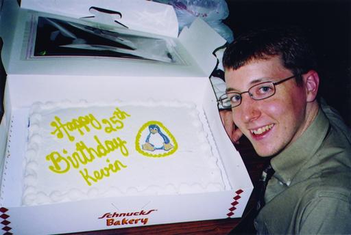 I happily submit this photo of my husband Kevin, with his Linux-inspired 25th birthday cake. He is an avid reader of your magazine and user of Linux at home and work.
