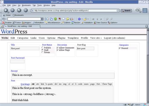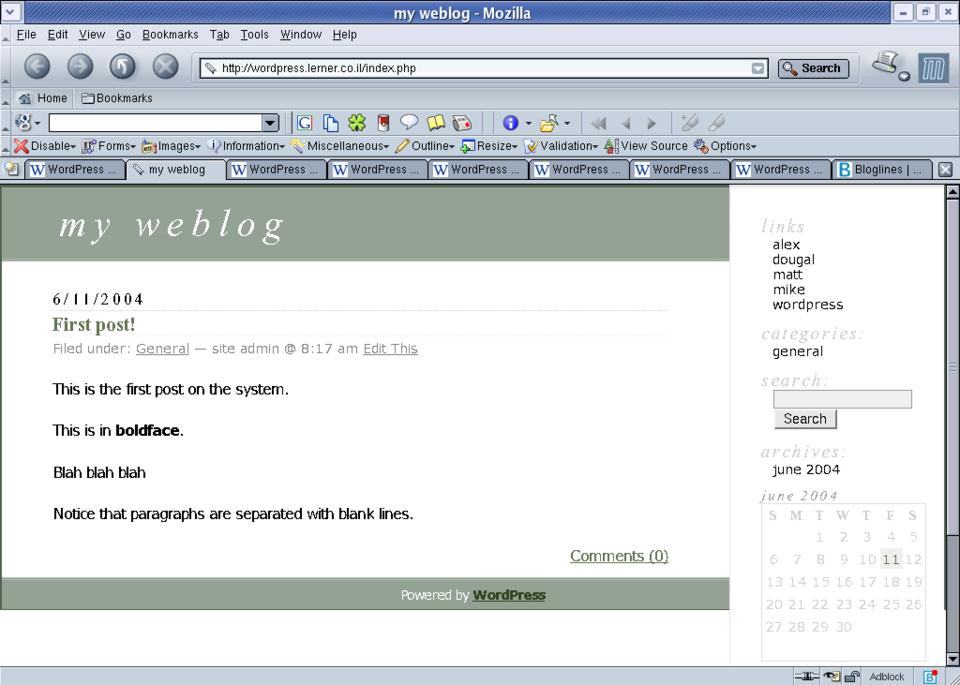Finally, the look and feel of a WordPress Weblog can be changed by modifying the CSS, which handles the fonts, colors, sizes and placement; the templates, which largely are standard PHP; and even the plugins, which can change almost anything. It is possible to change the template within WordPress itself, although I expect that most readers of this magazine would prefer to use Emacs or vi to change the file directly on disk.