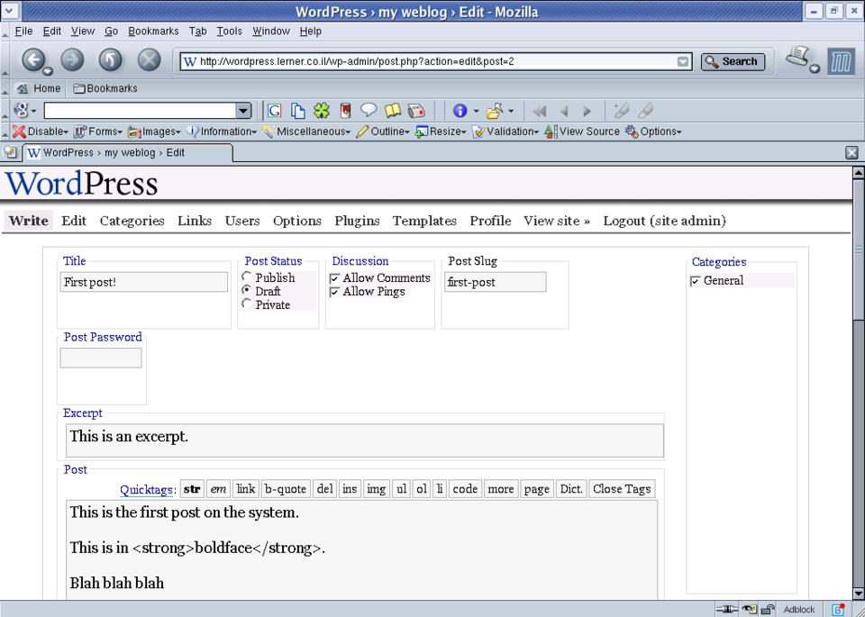 Like most software with good user interfaces, WordPress includes many small features that add up to a pleasant experience. For example, it automatically creates en and em dashes when you use two or three hyphens. It allows you to classify postings as drafts (the default), private or public, which means that you can start working on a Weblog entry, go to lunch and then return to work on it.