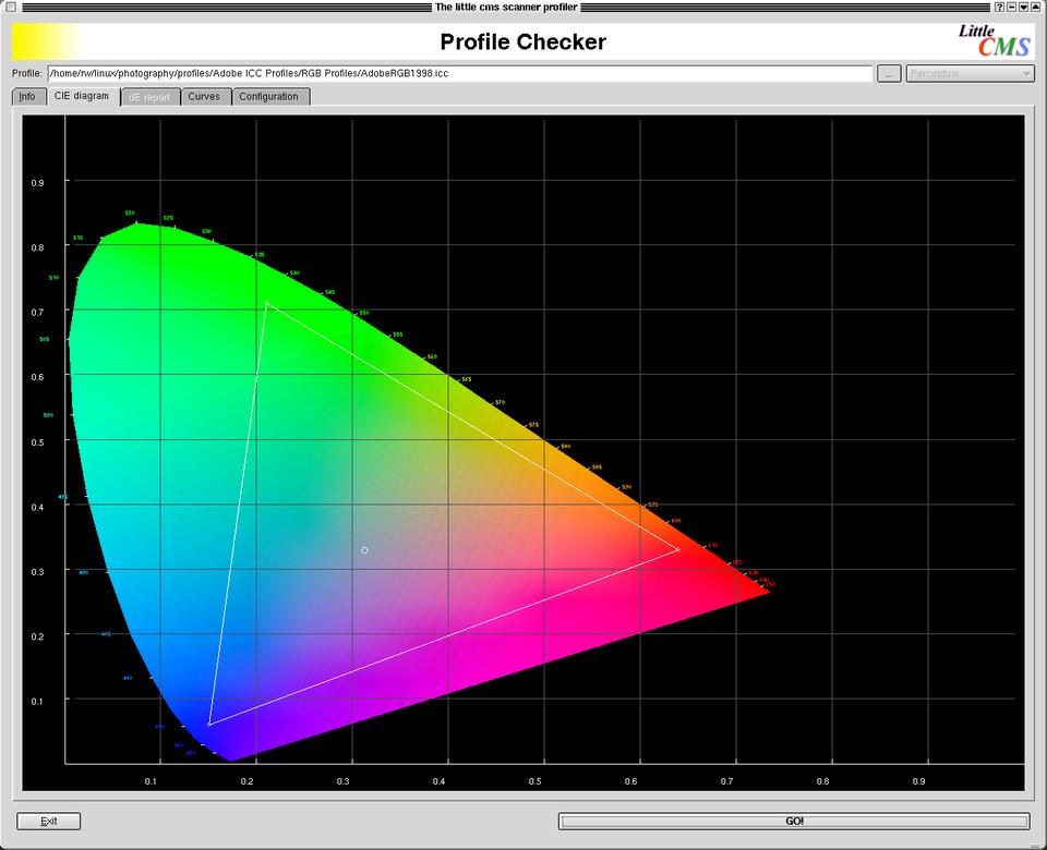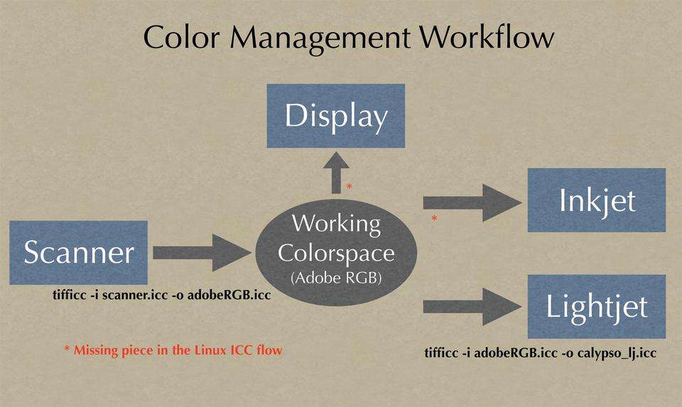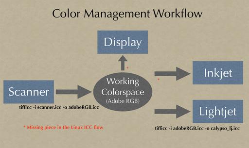 After scanning the transparency, the resulting TIFF file's color space is that of the scanner. I want to convert this color space to a working color space to do my image editing. A popular working color space is the Adobe 1998, a profile of which can be obtained from the Adobe Web site. Apply the scanner profile using tifficc, which is part of the Little CMS package, by running tifficc -i scanner.icc -o Adobe1998.icc scan.tiff scan_working.tiff, which converts the scanned TIFF image to our working color space.
