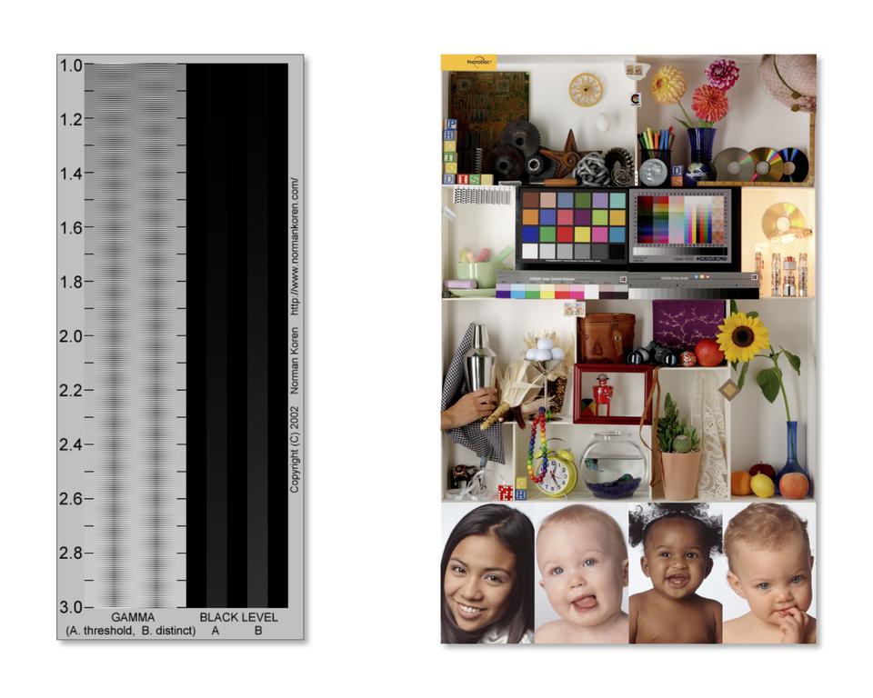 Figure 3. Monitor calibration images: on the left, Norman Koren's monitor gamma chart, and on the right, the Photodisc color calibration image. These printed examples should not be used for reference as their colors may have changed due to printing press inconsistencies.