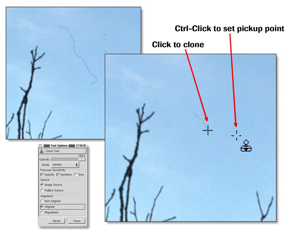 Cleaning up dust and scratches is the vital next step, and the Clone tool is perfect for this. Zoom in until the size of a dust spot is easily seen on the screen and then carefully scan the entire image. When you find a spot, select the Clone tool using a soft-edged brush that is slightly larger than the dust spot. Set the Clone Tool Options to 100% opacity and select aligned. Ctrl-click on an adjacent area to pick up an area to copy, release the Ctrl key and click directly on top of the spot. By using an opaque brush, the spot should be removed completely. The technique for removing scratches is similar, but you have to watch out for repeating patterns. With a little practice, you should be able to clone large sections without any telltale artifacts.