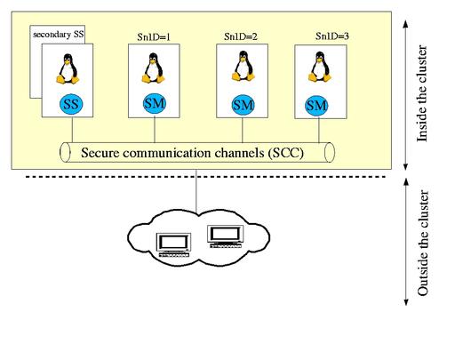 In this section, we briefly introduce DSI's architecture. DSI is composed of one security server (SS) and multiple security managers (SMs), one per node (Figure 1). The SS centralizes management of the cluster: it gathers alarms and warnings sent by SMs and propagates a unique security policy over the cluster. On the other hand, SMs are responsible for enforcing security on their own nodes. Furthermore, messages are exchanged between the SS and SMs over encrypted and authenticated channels, using SSL/TLS over CORBA event channels.