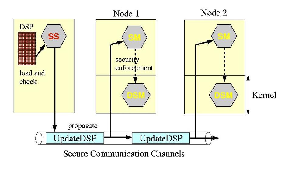 DSI provides a way to update and enforce transparently and automatically a unique homogeneous view of the whole cluster's security. Once the administrator modifies existing rules or adds a new rule to the distributed security policy (DSP), the DSP must be loaded on the SS using the dsiUpdatePolicy tool. Then, dsiUpdatePolicy checks the DSP file against our DSP XML schema (syntactical checks). If the DSP is validated, the SS propagates the new rules to all nodes of the cluster using the secure communication channels. Finally, each SM enforces the rules at kernel level calling the distributed security module (DSM, see Figure 2). DSM is based on the LSM kernel patch. Its detailed description is beyond the scope of this article; see the on-line Resources section for links to more information.