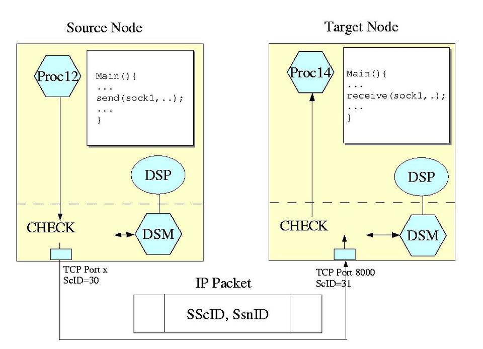 Then, the ScID and SnID of the requesting process are added by DSM to each IP packet sent to the remote node.