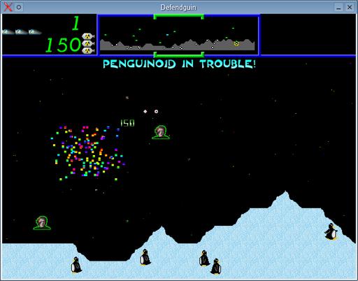 Once upon a time, there was a rather popular arcade game called Defender, which over time, spawned a huge number of imitators (or homages). One of these creations, Bill Kendrick's Defendguin, pits our hero Tux against evil aliens bent on enslaving, assimilating and mutating a planet of peaceful penguins into deadly penguinoids. These aliens, who look an awful lot like the guy named Bill from XBill, turn the helpless denizens into flying, killing machines. Once a penguin gets transformed into a penguinoid, there is no hope for the poor beast—just blast it. Better yet, blast the alien intruders and get those points up (Figure 2).