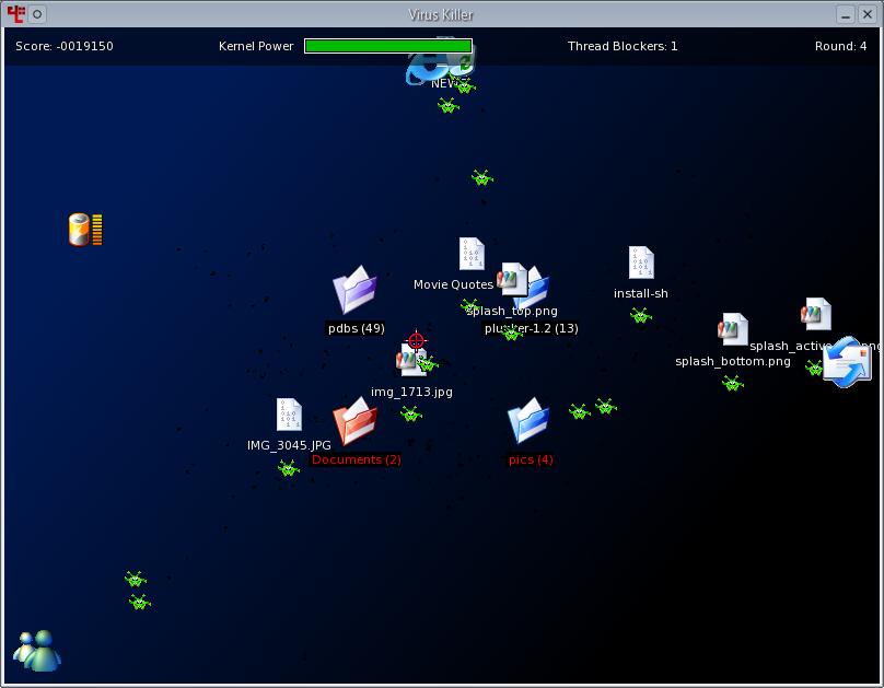 To play, simply type viruskiller. The program builds its list of files and directories based on your home directory. These then are the targets that the viruses in the game try to infect or otherwise destroy. Your job is to blast the little monsters before they can do any damage. As the Web site's FAQ points out, the viruses in the game do not actually destroy anything—it is only a game. If, however, you feel nervous seeing a little green monster drag away that document you've spent hours working on, try this version of the command: viruskiller +safemode.