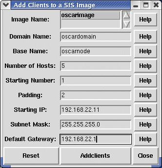 In the Define OSCAR Clients step, you can specify the domain name, base name of your clients, the number of nodes you want to bring up for this session and other network settings. After you click the Add clients button, these definitions are configured and the cluster is almost ready to be rolled out.