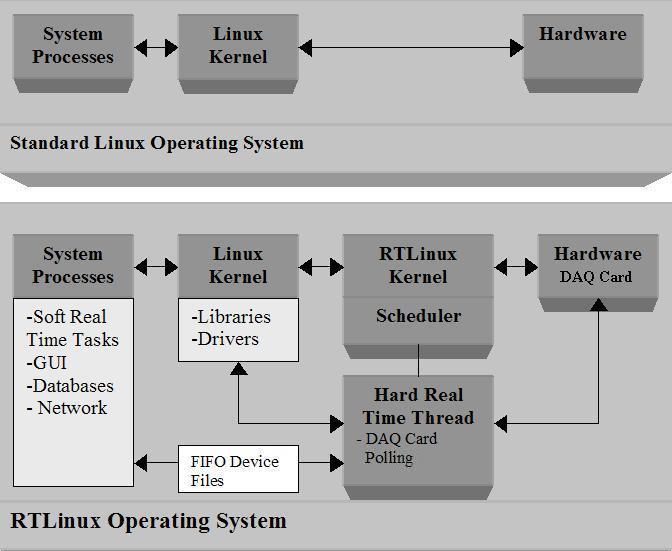 In the RTLinux operating system, also illustrated in Figure 2, the real-time task is isolated from the rest of the system processes and is implemented as a module. The module gains direct access to the hardware and the DAQ card drivers while receiving the priority that it needs over the rest of the system. The module is written to perform a specific task that produces reliable results and presents them to the user through the FIFO device files. The code for the module is kept simple, performing only tasks that must be held to hard real-time restraints. Connecting a handler function to one of the FIFO device files can control the module from the operator interface program. This structure, produced by RTLinux, ensures that the kernel cannot delay important module task with secondary priorities.