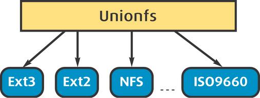 To use Unionfs, you first need to compile the Unionfs module and load it into the kernel. Next, like any other filesystem, Unionfs is mounted. Unlike other filesystems, Unionfs does not mount on top of a device; it mounts on top of directories that are specified as a mount-time option. To create a union, we mount Unionfs as follows: