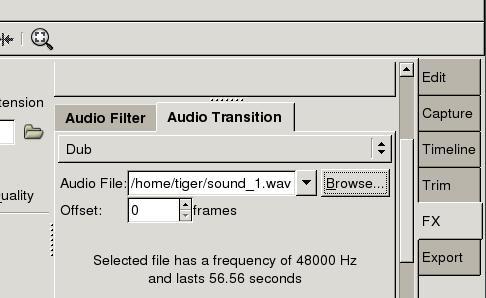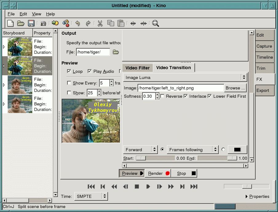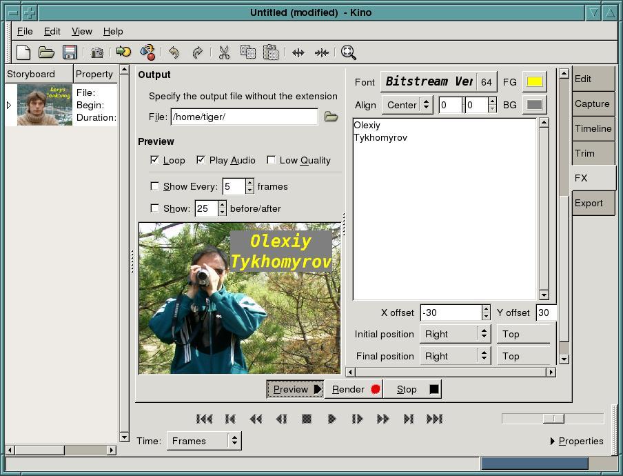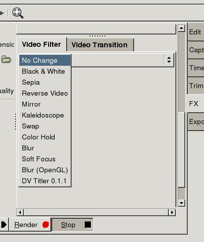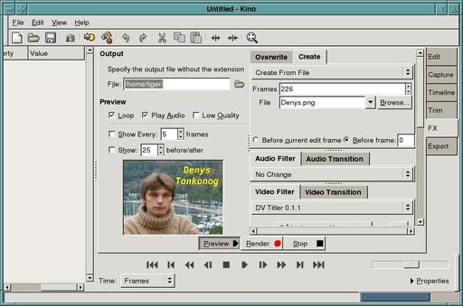 As far as software, you need Kino and the libraries it uses, but this is not everything. Kino provides only basic tools for editing and has few effects. Tim Shead and Dan Dennedy have been developing timfx, a set of Kino plugins that adds extra effects. Another plugin, called dvtitle, by Alejandro Sierra is needed for adding titles.