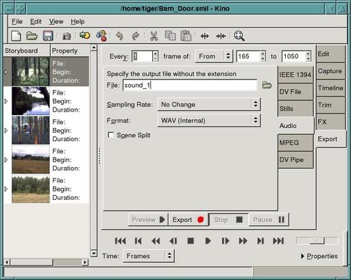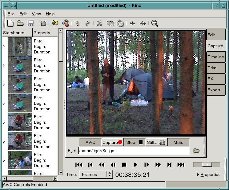 • A DV file that stores the movie in a new file format, which can be used further for compression and exporting without the Kino interface.