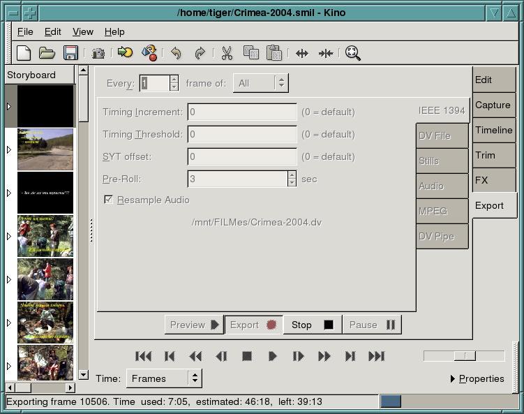 If everything is okay, you can stop the camcorder, put the tape exactly at the position from where you want to write the movie and start exporting. The time needed for writing is equal to the movie duration. While exporting, Kino indicates the elapsed and remaining time in the bottom of the export window.