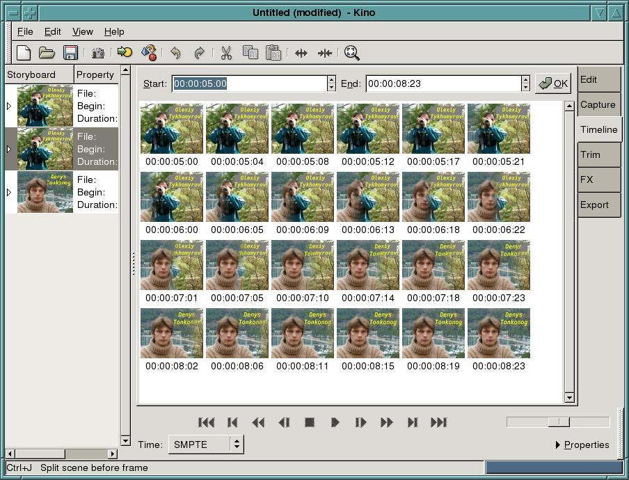Kino still is under development and may crash sporadically when you are using Edit or Trim, so make sure you save your movie project regularly. Although Kino watches the files it creates, it may lose control of them in the case of a crash. In order to keep your hard disk clean, do not forget remove unused .dv files.