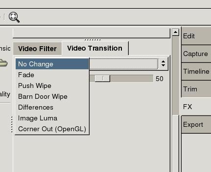 Kino provides the Barn Door effect itself. Additional effects are available through timfx. Figure 6 shows the complete list. Many effects are well known, such as what we illustrate here with creating titles.