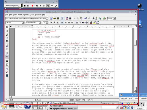 As you will notice, each workstation today is equipped with a small Webcam and microphone. The immediate idea is that we (or someone else) will wind up as the star of our little movie, but sometimes the software itself is the star. After all, many an application has shone on Chez Marcel's menu, non? And, this is where Karl Beckers' xvidcap comes into play. xvidcap is a great little tool for recording the action on your X desktop using a program called ffmpeg, which likely is already on your system. The result is an MPEG movie of your entire desktop or any portion thereof.